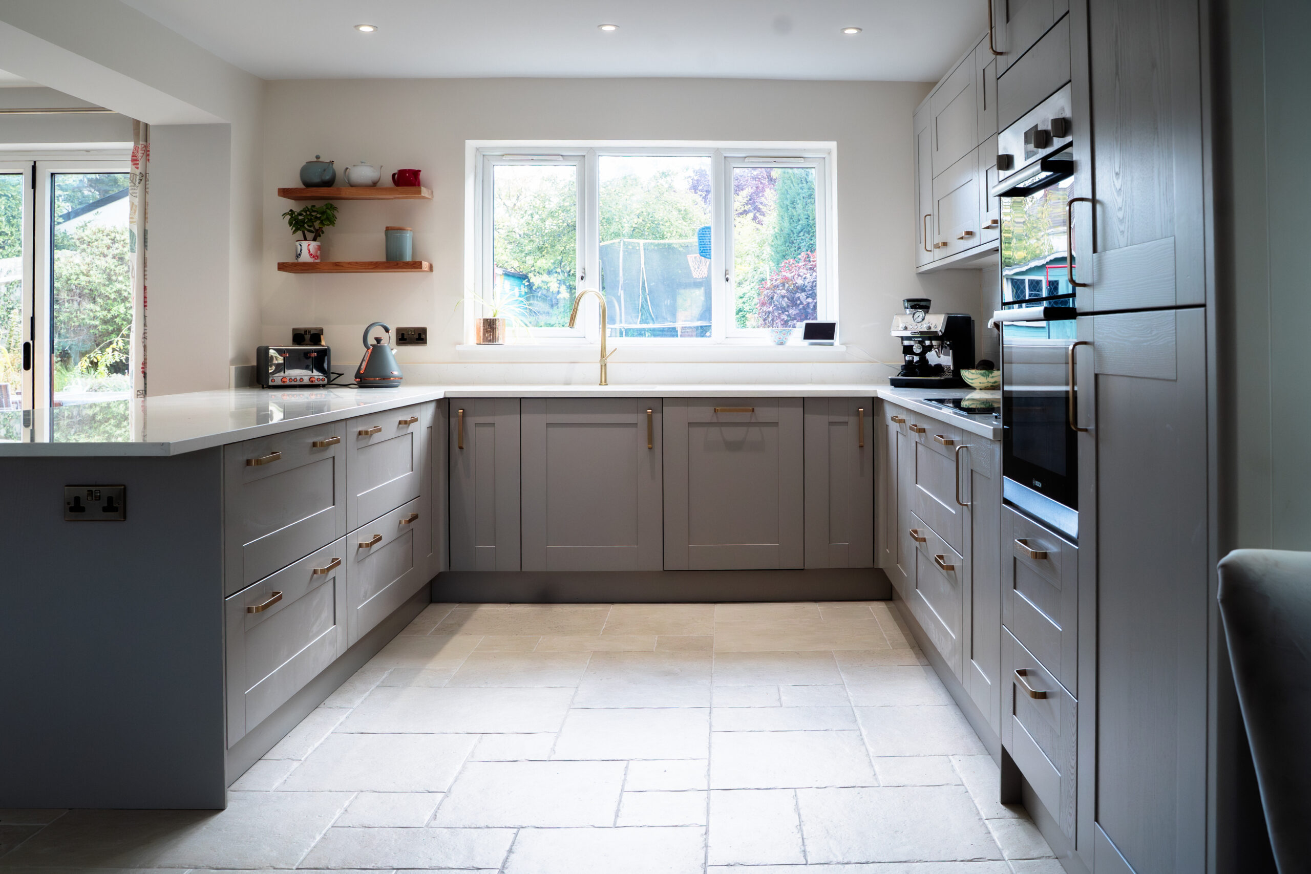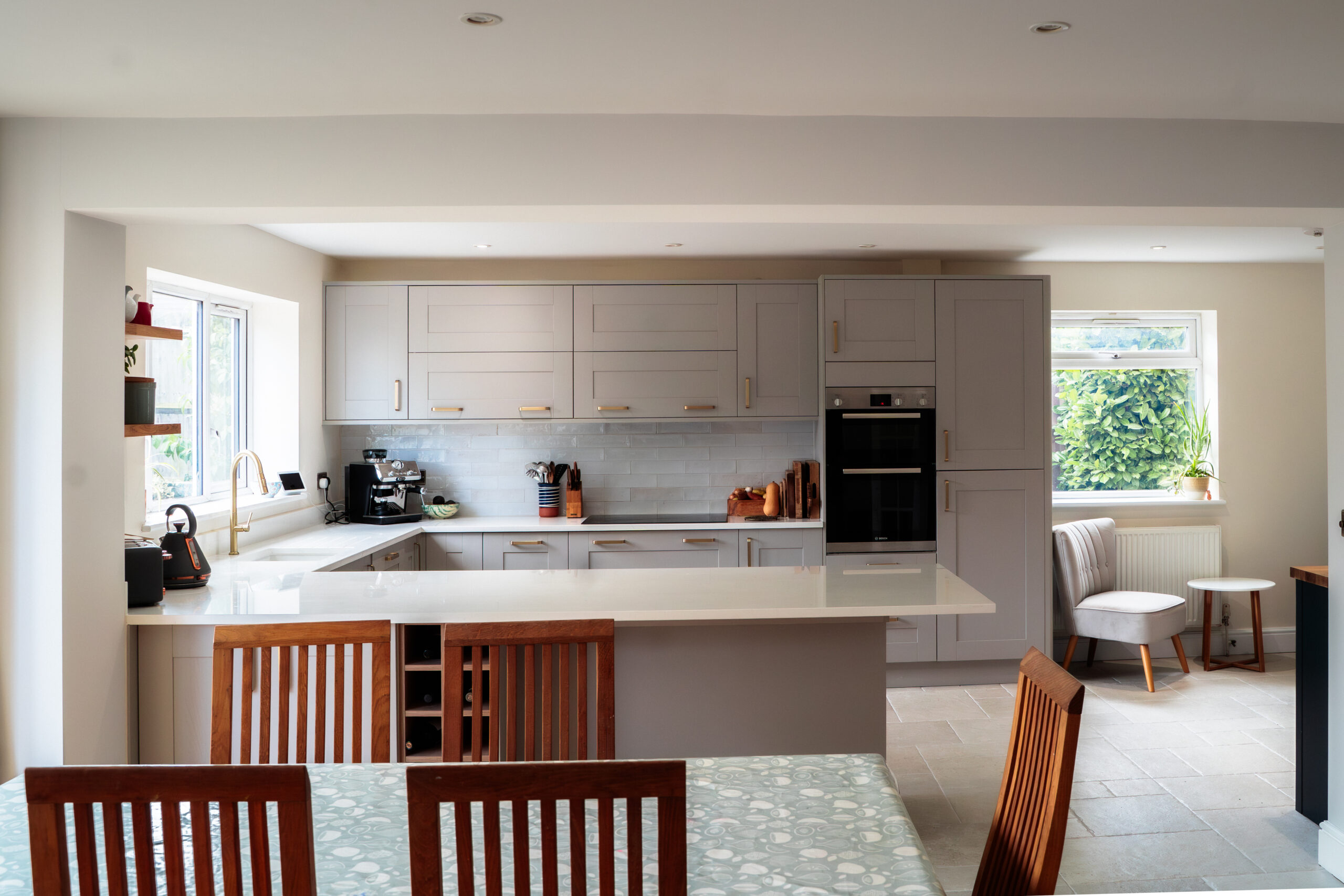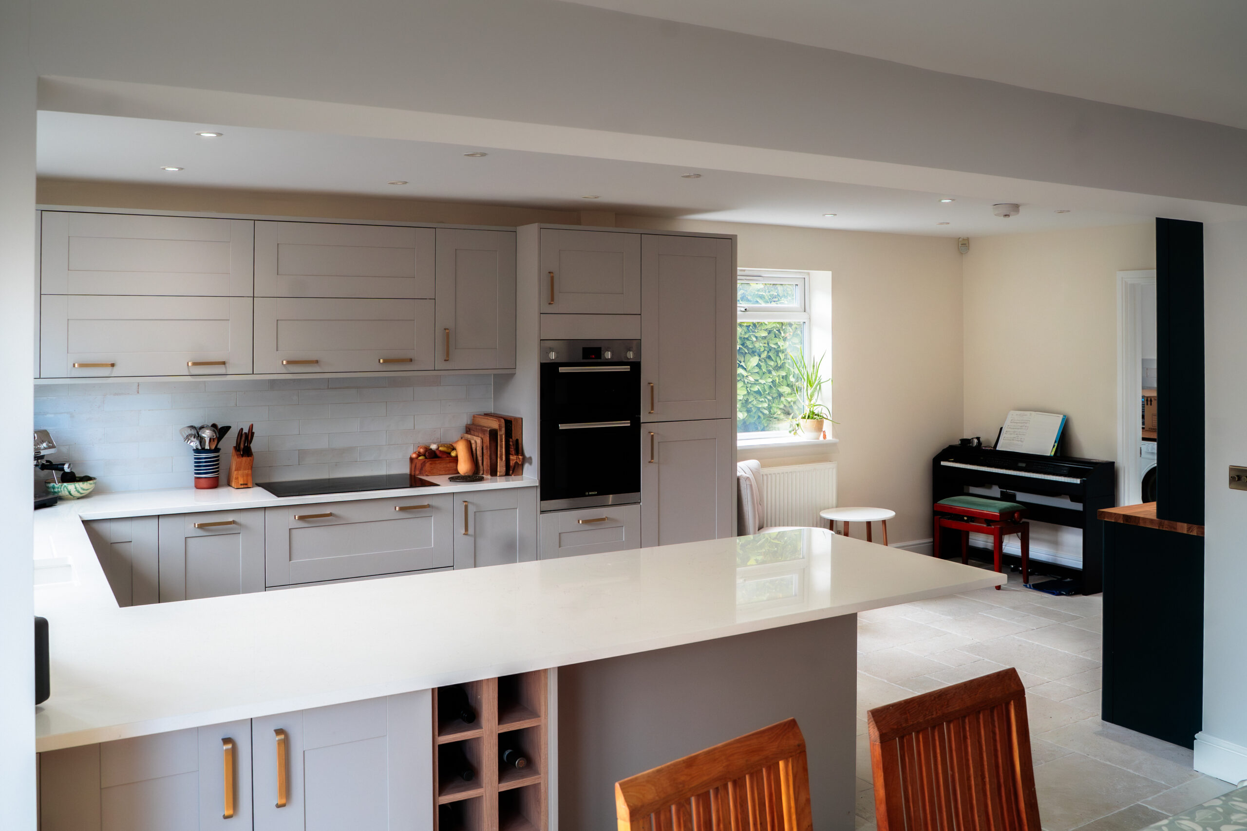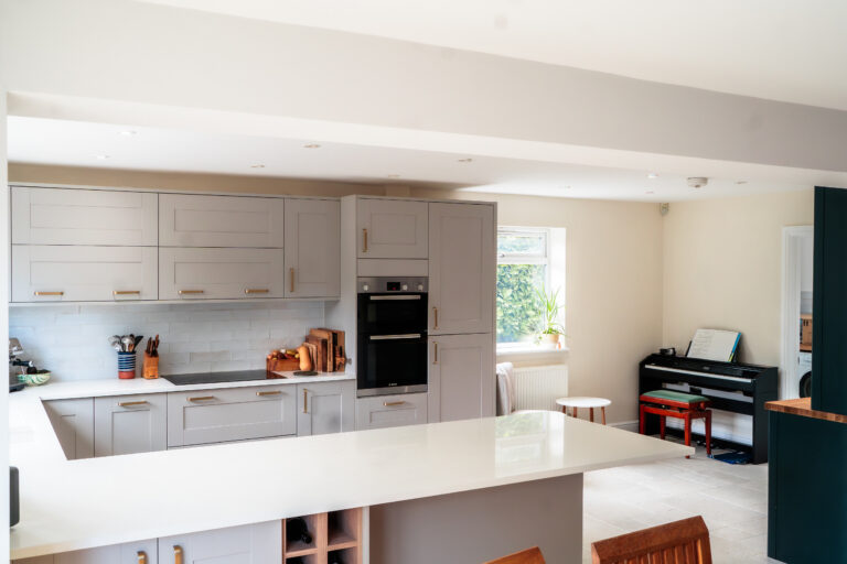 A key element of this project was the structural transformation of the space, allowing the kitchen to open fully into the adjoining living area. The installation of a load-bearing beam was carefully executed and fully integrated into the ceiling for a seamless finish.